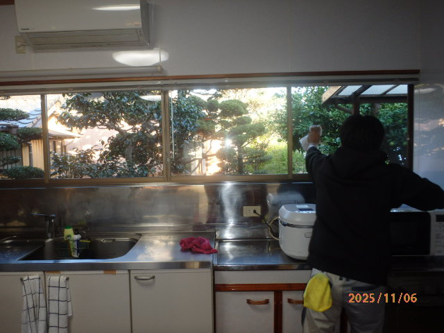 大きな台所の窓は汚れやすく、多くの檀家様が集まって調理をする機会もあるため、丁寧に清掃します。